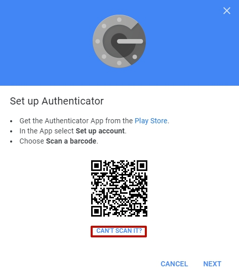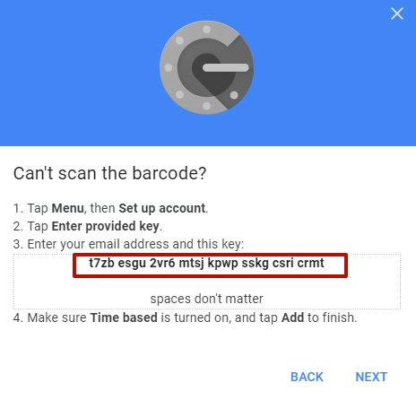 Ви також можете додати секрет вручну. В даному випадку, Ви маєте натиснути на посилання "CAN'T SCAN IT?". Буде відкрито вікно, в якому цей код буде представлено у текстовій формі: