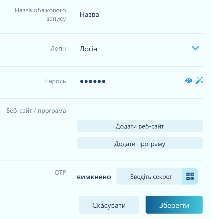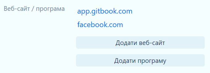 Веб-сайт / програма - Адреси веб-сайтів, де цей обліковий запис може бути використано та назви програм. Натисніть кнопку Додати веб-сайт, щоб додати адресу веб-сайту та Додати програму, щоб обрати назву програми.