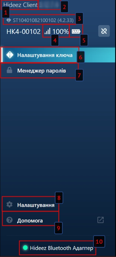 Під'єднано – з'єднання між Hideez Key та ПК. Зелений індикатор означає, що з'єднання встановлено, червоне - що з'єднання немає. Щоб встановити з'єднання ключ має бути у діапазоні з'єднання Bluetooth комп'ютера та підключеним до ПК по Bluetooth.