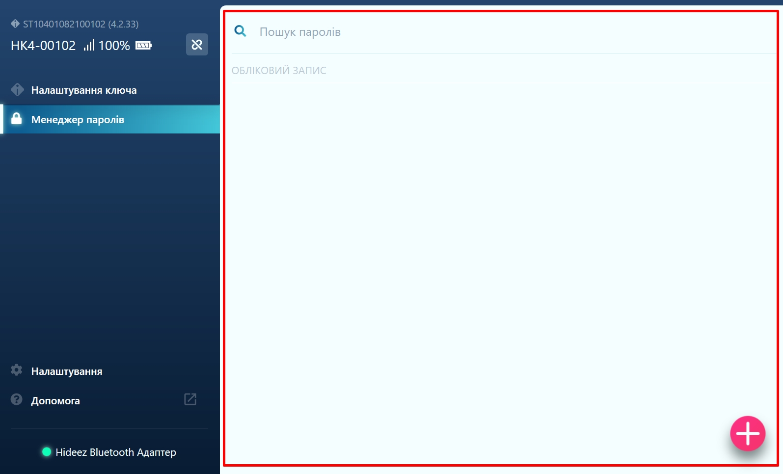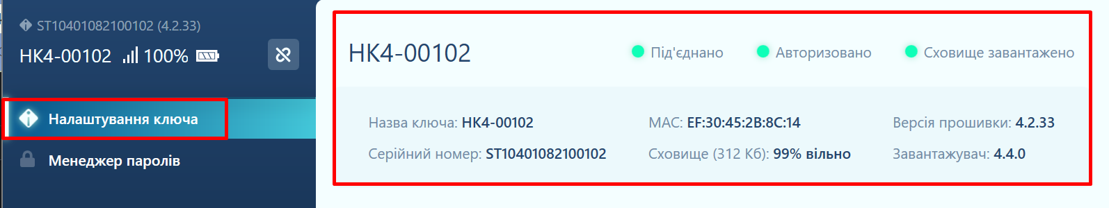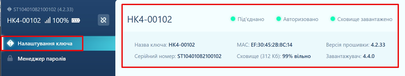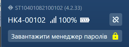 Сховище завантажено – статус завантаження даних з ключа. Зелений індикатор означає, що ключ авторизовано, дані завантажено і доступний розділ Менеджера паролів. Червоний індикатор означає, що ключ не може пройти авторизацію.