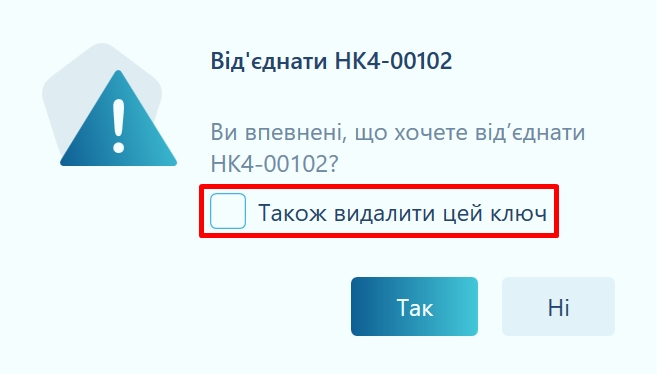 Видалення ж означає, що на додачу до відключення буде ще й видалено з'єднання між ключем та робочею станцією. Для видалення ключа оберіть опцію "Також видалити цей ключ" у наступному діалоговому вікні: