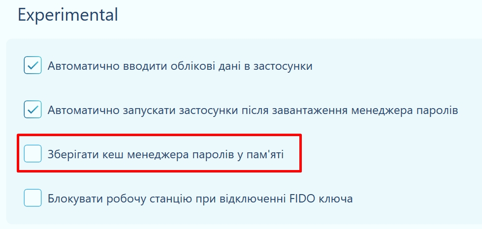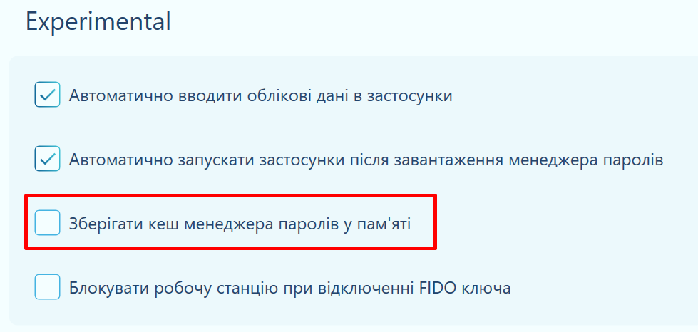 Ця опція дозволяє програмі Hideez Client кешувати менеджер паролів протягом одної сесії. Коли сховище відключається від робочої станції протягом одної сесії Hideez Client, менеджер паролів залишається закешованим у пам'яті програми. Таким чином, Hideez Client не має завантажувати усі дані заново, щойно ключ знову підключається до програми, сховище готово до використання одразу.