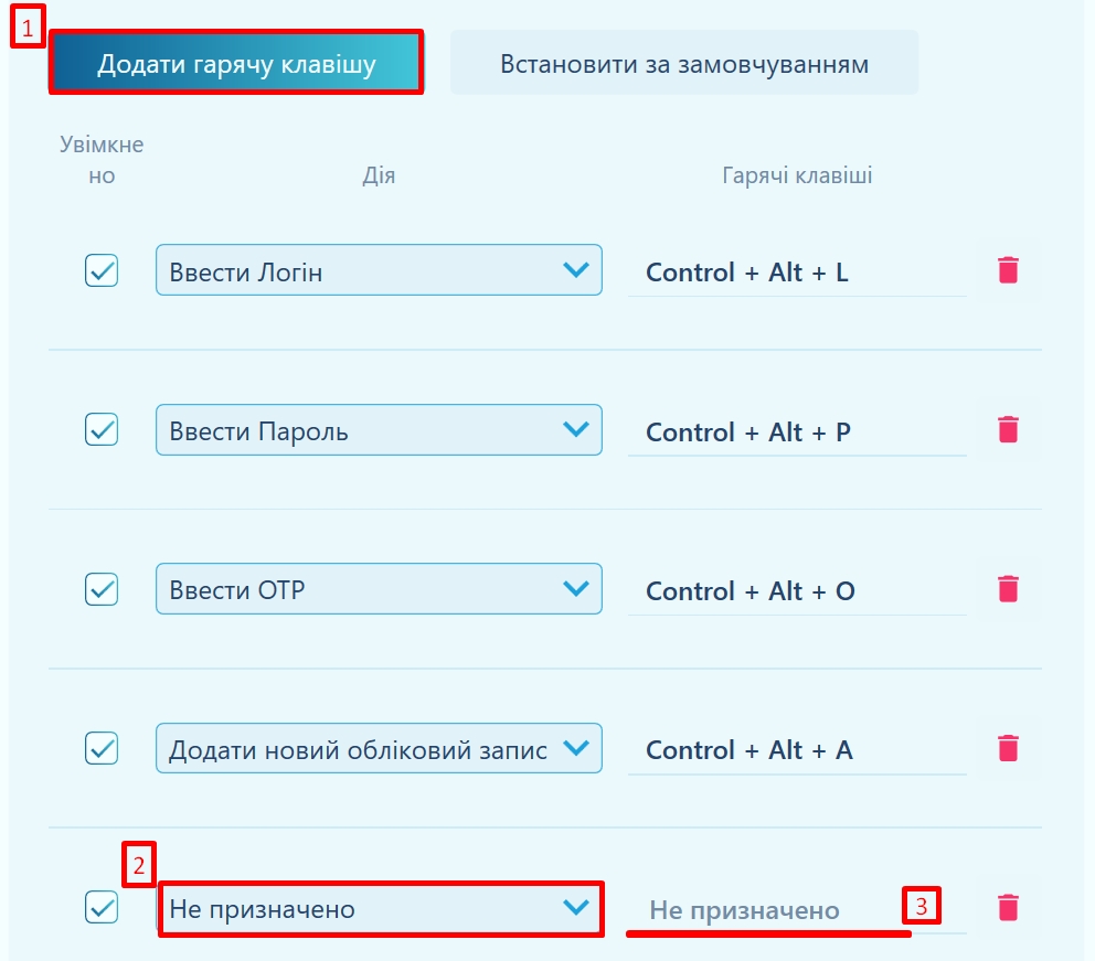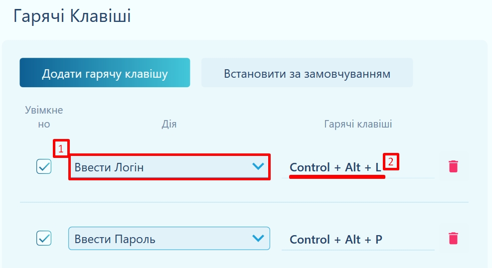 Щоб видалити, натисніть значок Смітника біля бажаної комбінації (2).
