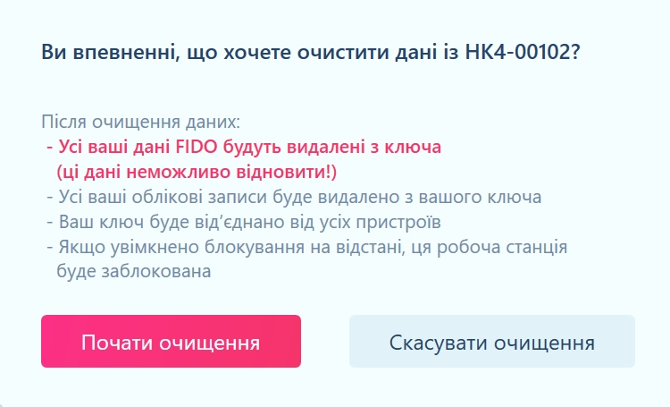 Очищення це процес повного та безповоротного видалення даних з вашого Hideez Key.
