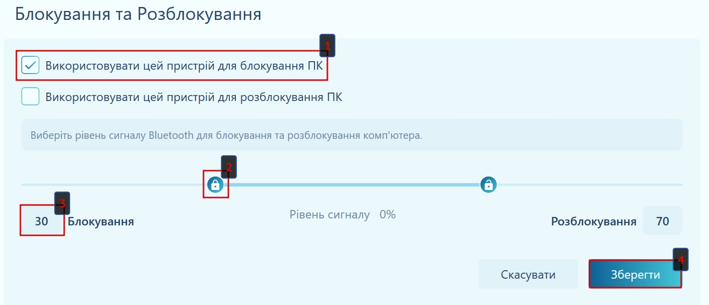 Розблокування ПК лише за механізмом проксіміті. Щойно рівень сигналу Bluetooth перевищить задане значення у %, ваш ПК буде розблоковано.